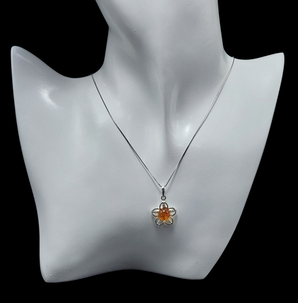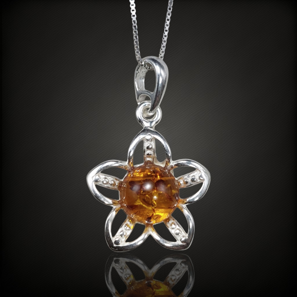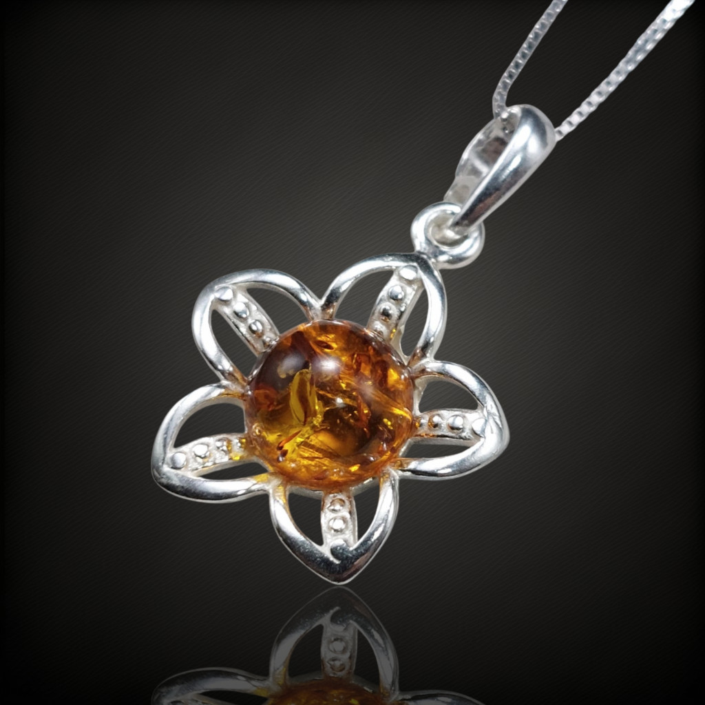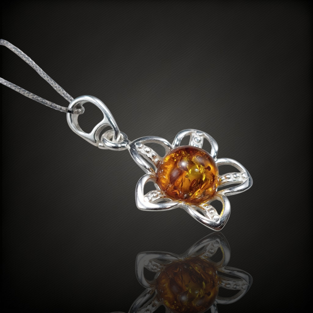 Különleges, virág alakú borostyán köves ezüst medál meleg árnyalatú kővel és nyugtató energiákkal.