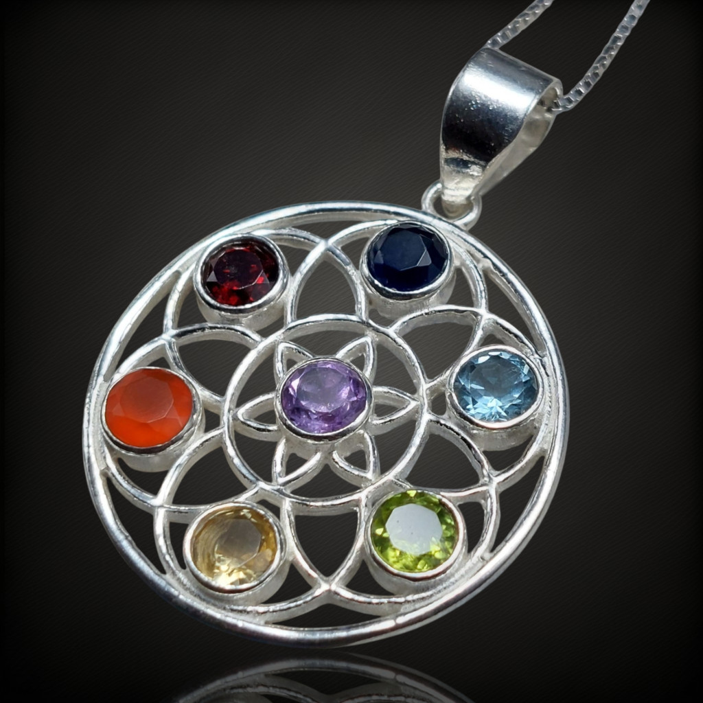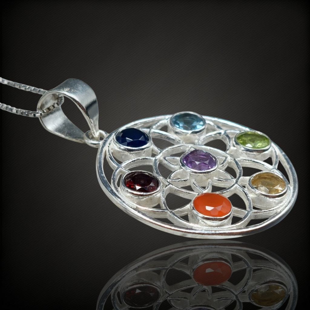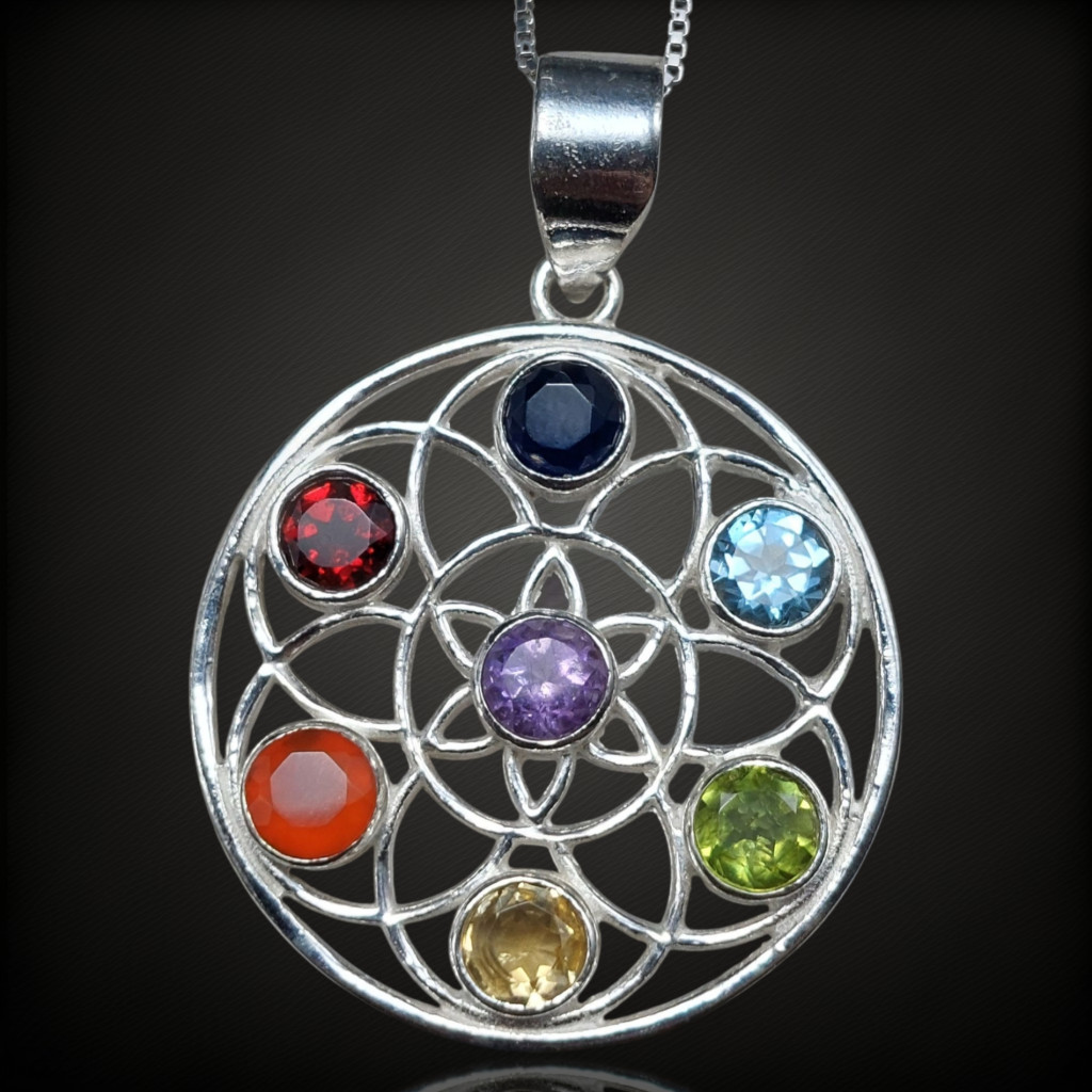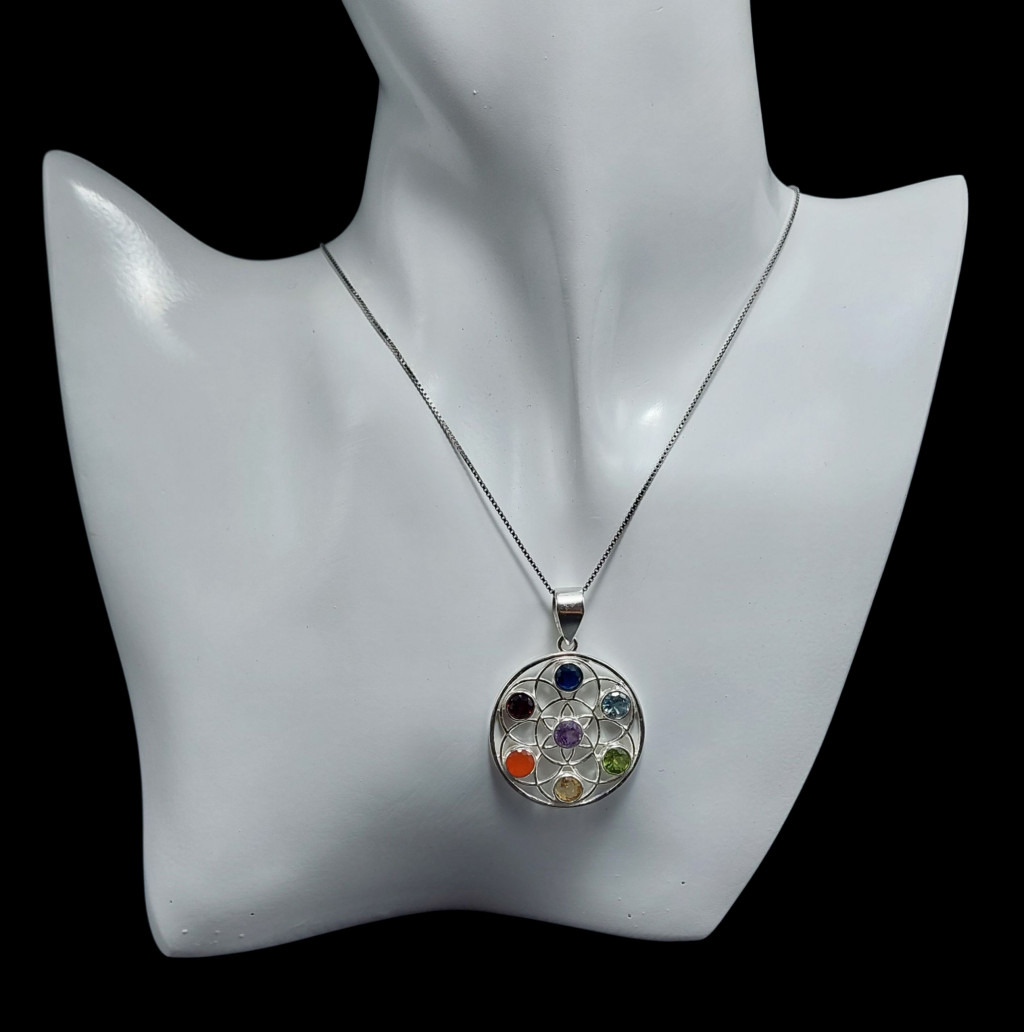 Csakra ezüst medálA medál magassága bújtatóval együtt 41mm.5mm nagyságú iolit, topáz, olivin, citrin, karneol, gránát és ametiszt kövekkel.Az ékszer anyaga 925-ös finomságú ezüst. A kő színe élőben kis mértékben eltérhet a képen láthatótól!A nyaklánc nem tartozék!