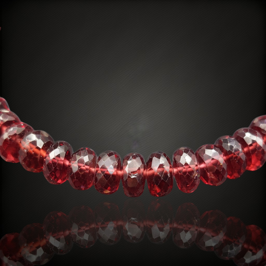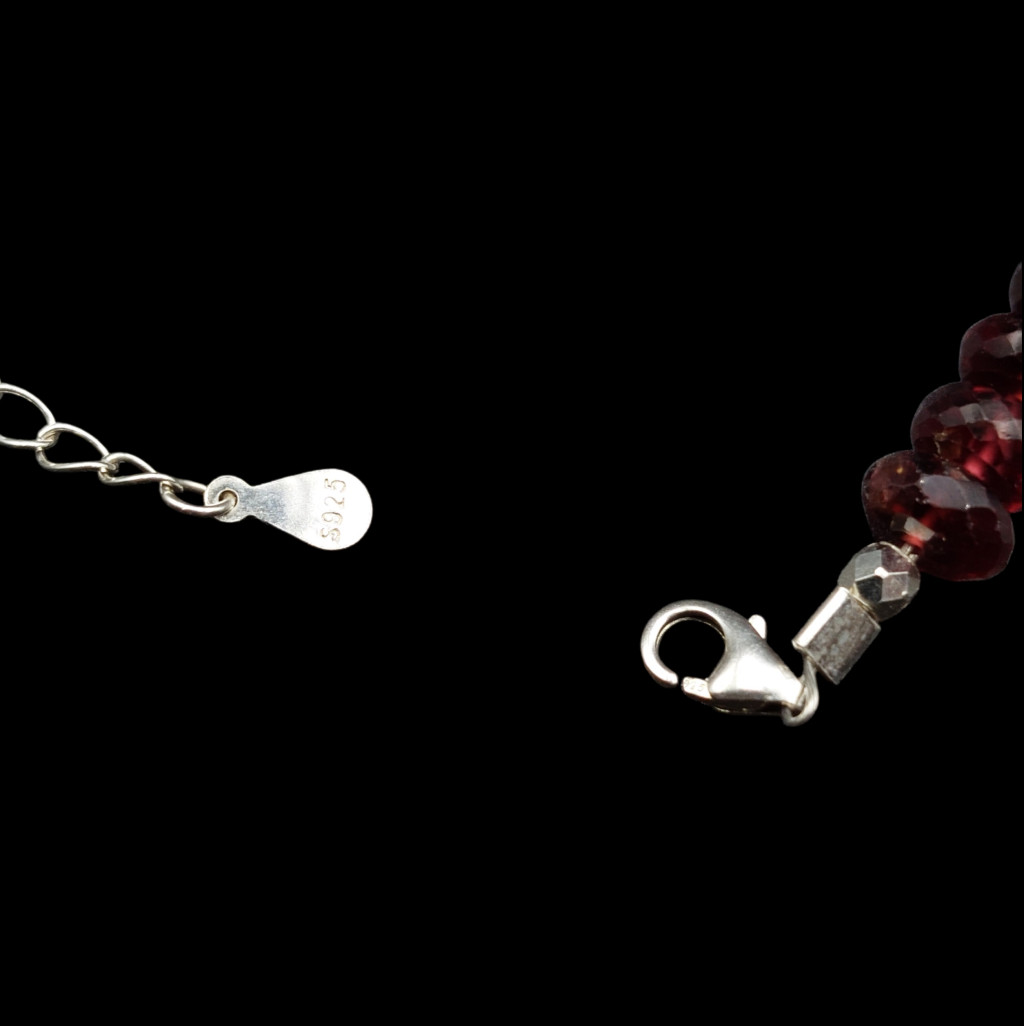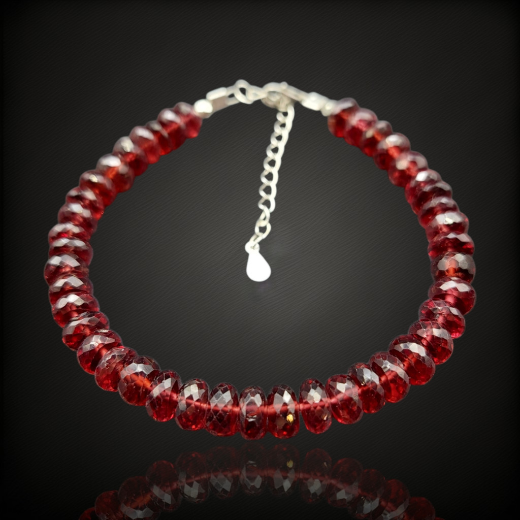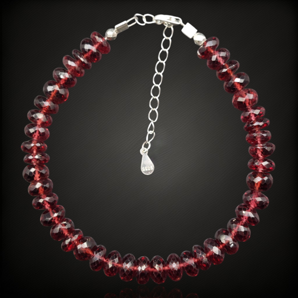 PRÉMIUM minőségű fazettált csiszolású gránát karkötő.A karkötő 17.5-22mm között állítható.A szemek nagysága: 7mm.A szerelék anyaga 925-ös finomságú ezüst.A kövek színe élőben kis mértékben eltérhet a képen láthatótól!