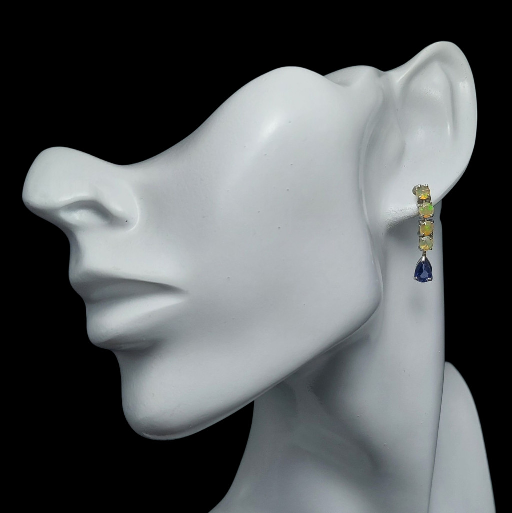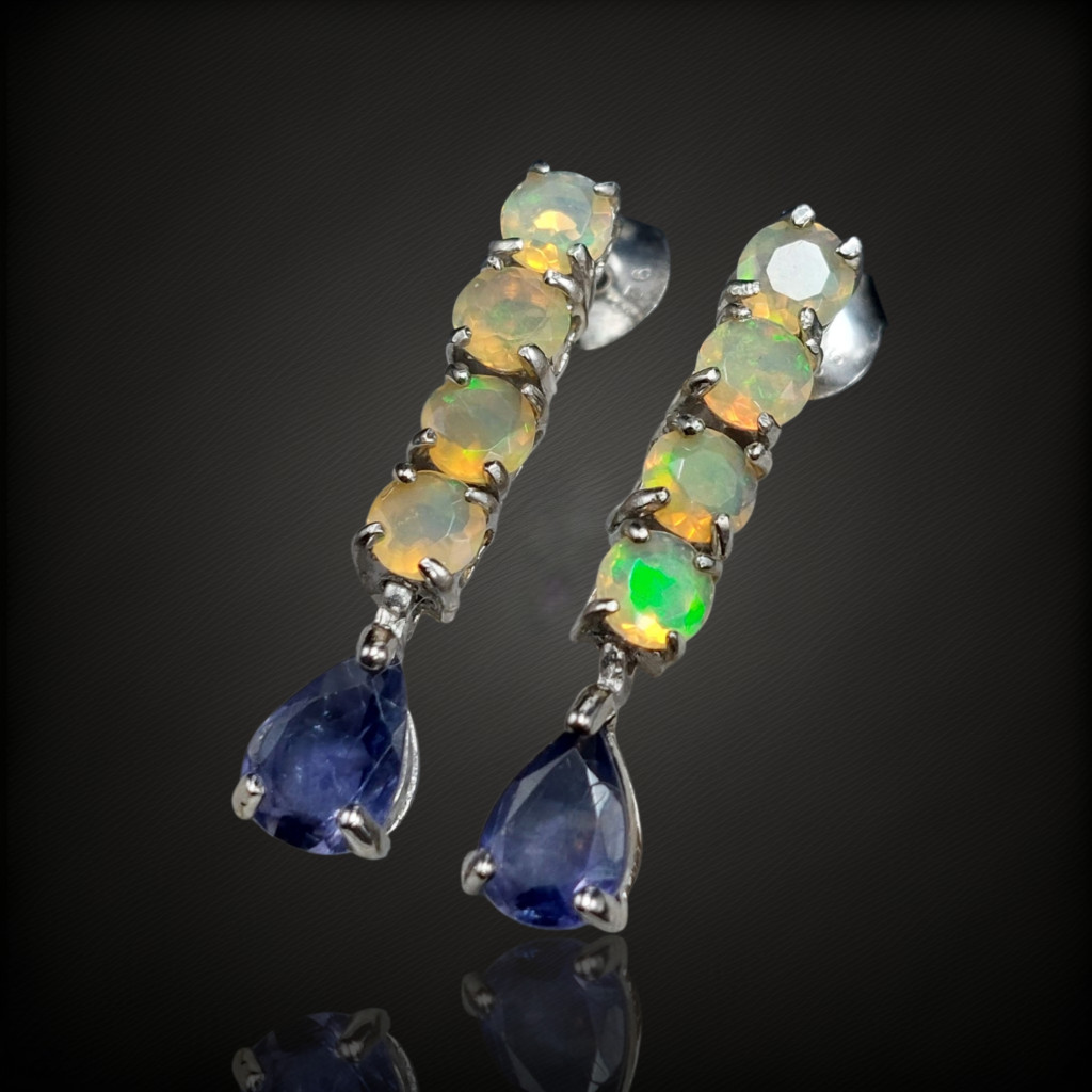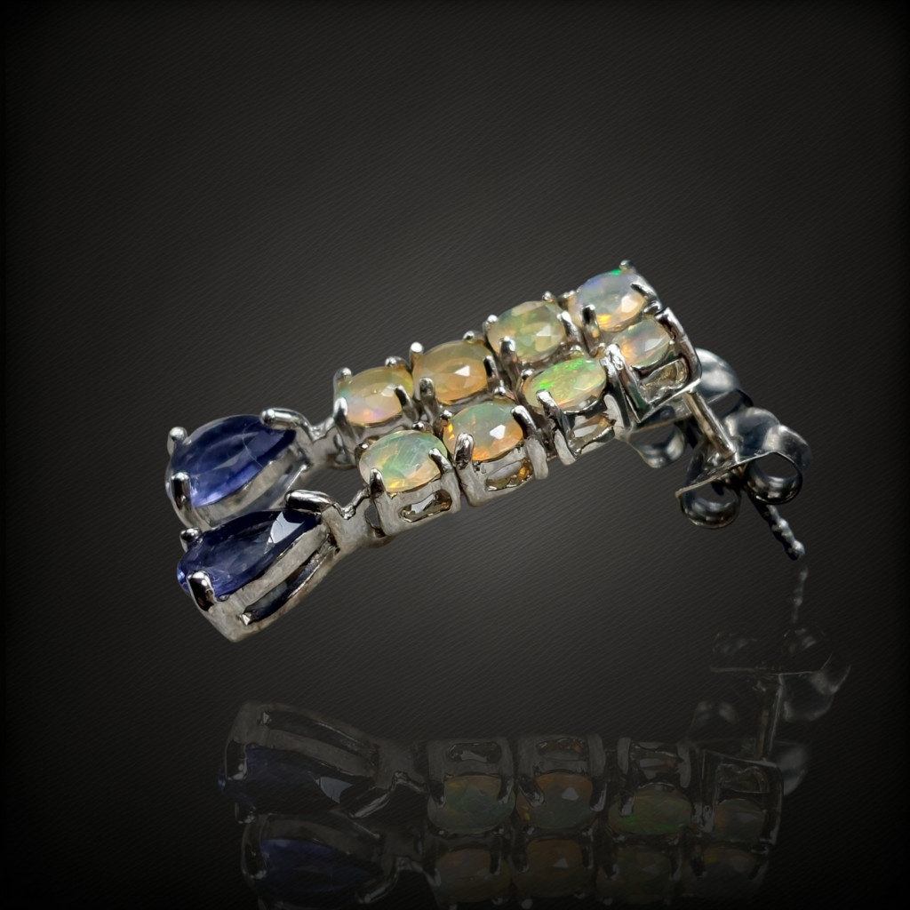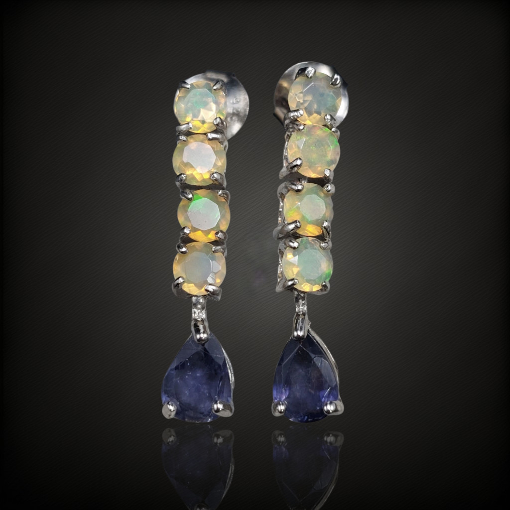 Iolit és nemesopál köves lógós-beszúrós fazonú ezüst fülbevaló.A fülbevaló hossza: 25mmA kövek nagysága: mm, származási helyük: India, EtiópiaAz ékszer anyaga 925-ös finomságú ezüst 14 karátos fehérarany bevonattal.A kövek színe élőben kis mértékben eltérhet a képen láthatótól!
