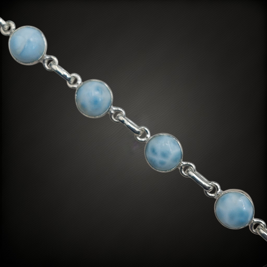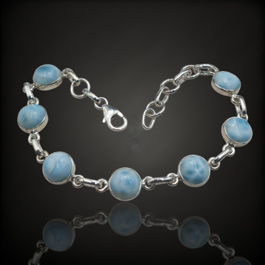 Larimár köves ezüst karkötő A kövek nagysága: 8x8mm, származási helyük: Dominikai KöztársaságA lánc hosszúsága 16-19.5cm között állítható.Az ékszer anyaga 925-ös finomságú ezüst.A kövek színe élőben kis mértékben eltérhet a képen láthatótól.