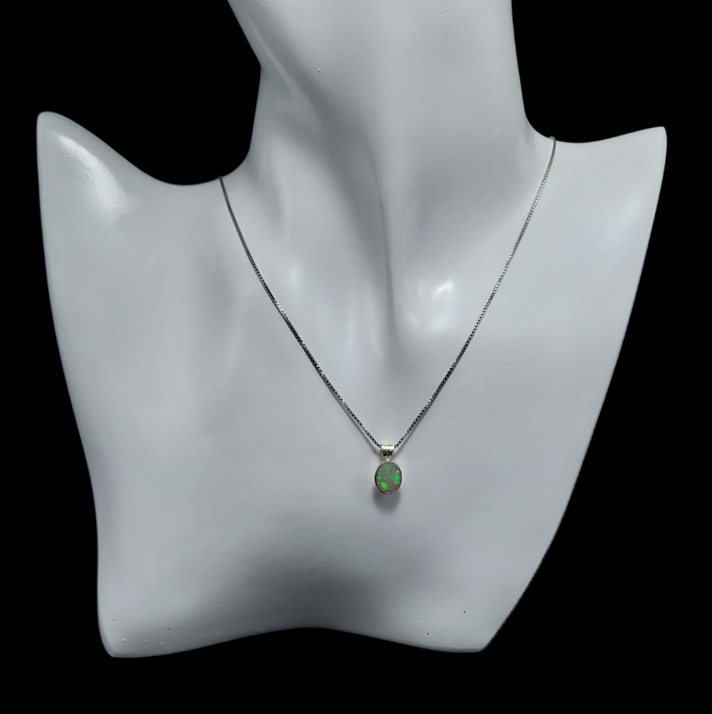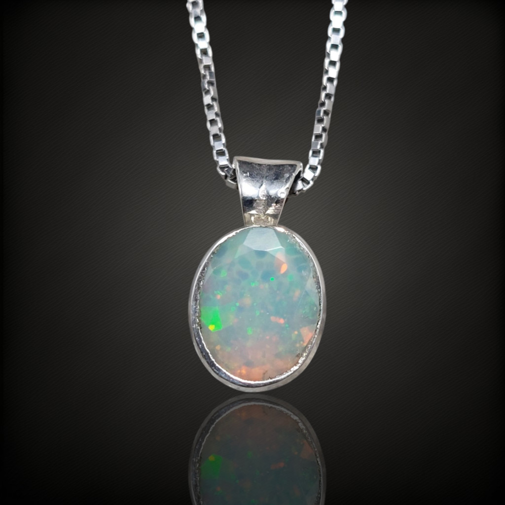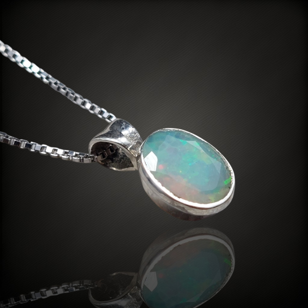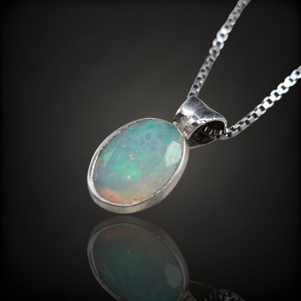 Ovális, tokos foglalatú ezüst medál fazettált csiszolású etióp nemesopállal – finom színjátékkal.