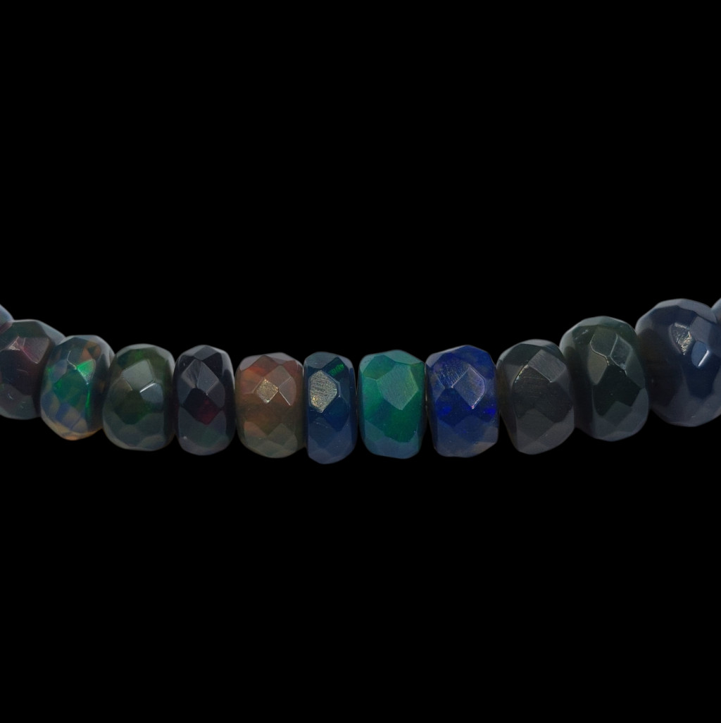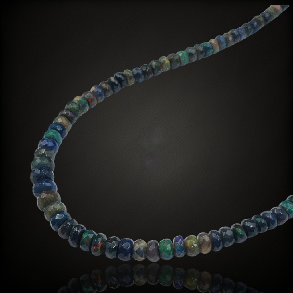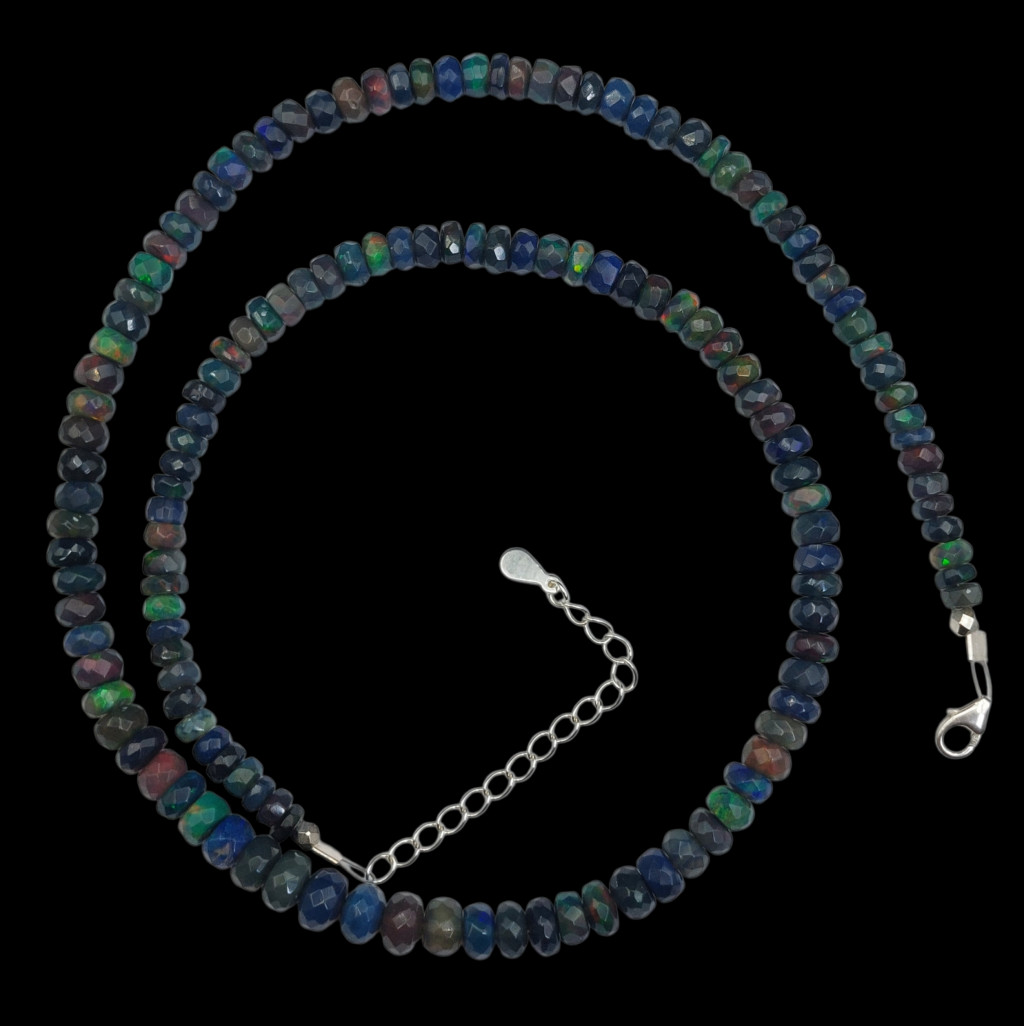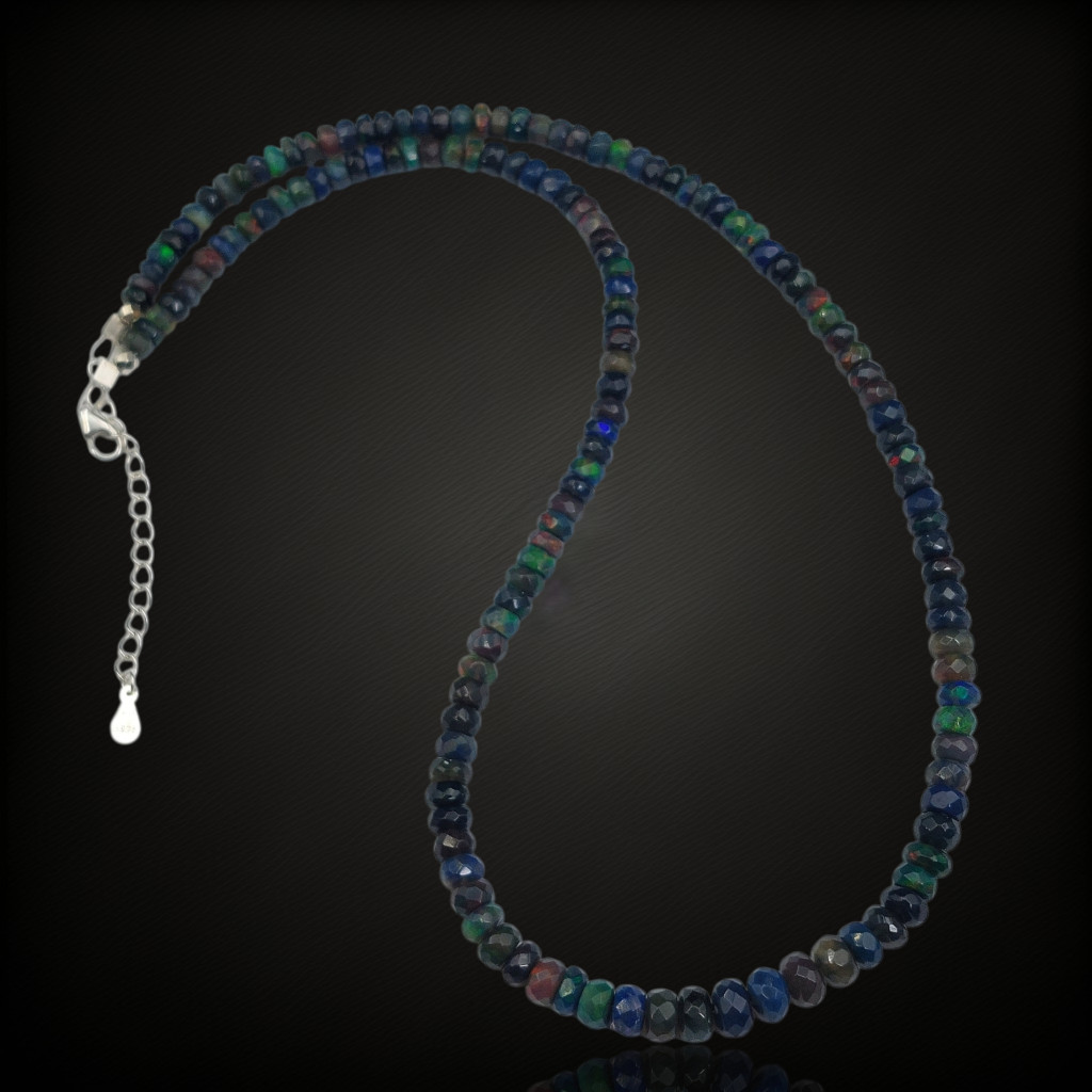 Fekete nemesopál nyaklánc.A nyaklánc 43-47cm között állítható.A szemek fazettált csiszolásúak, nagyságuk: 4-6mm.Az ékszer szereléke 925-ös finomságú ezüst.A kövek színe élőben kis mértékben eltérhet a képen láthatótól!