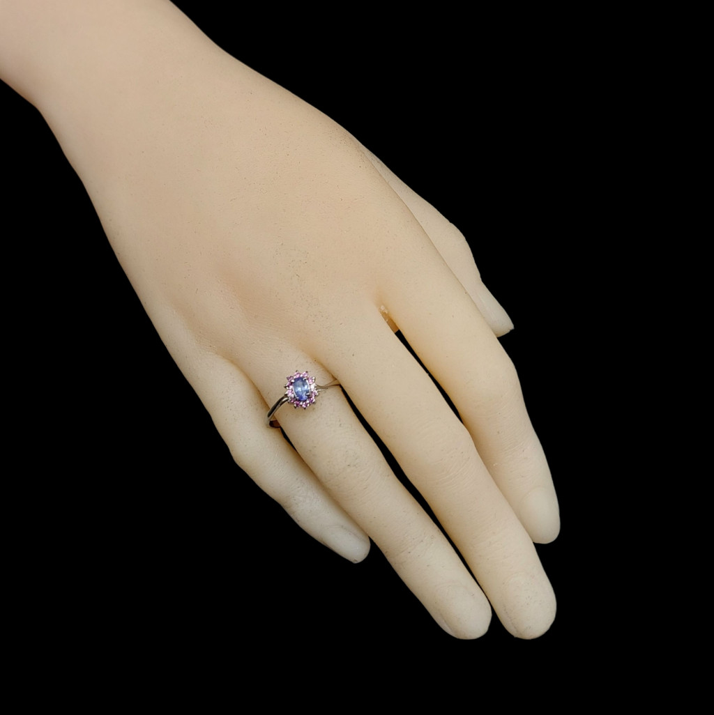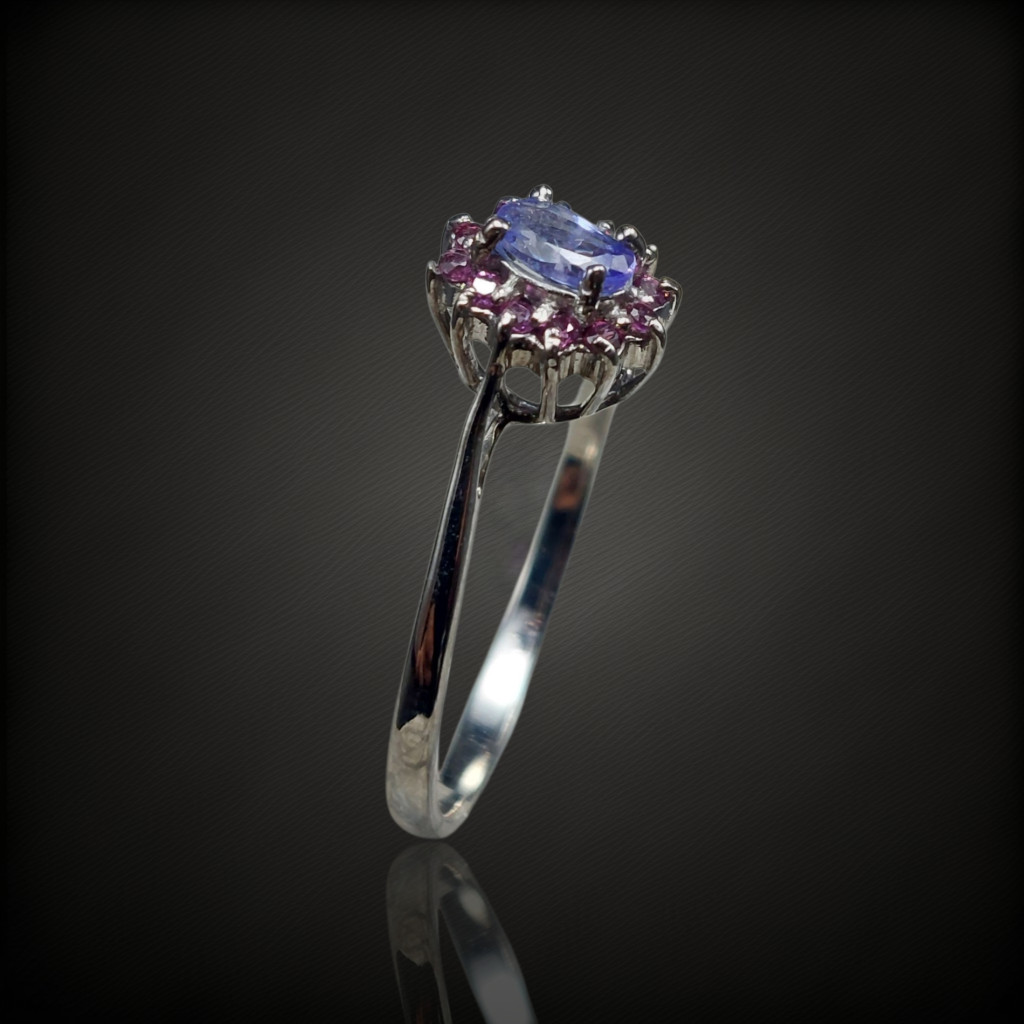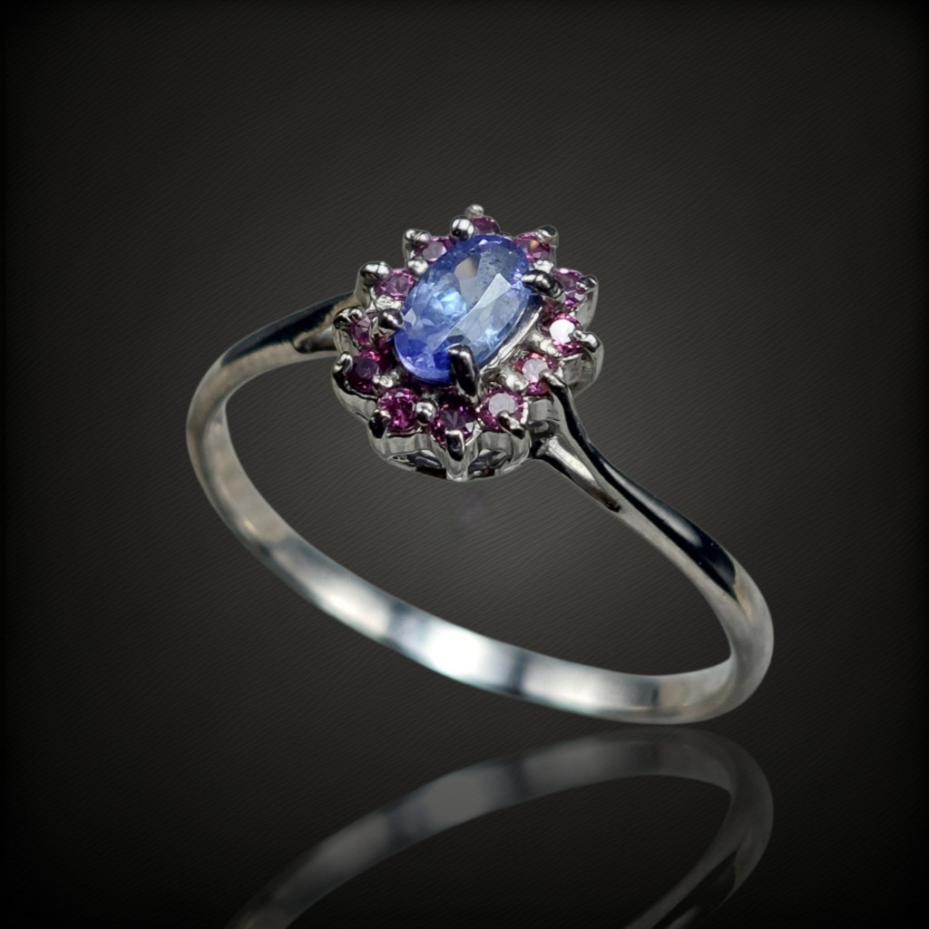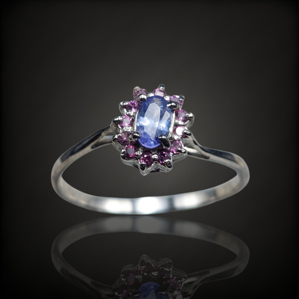 Tanzanit köves ezüst gyűrű rodolit gránát díszítéssel.