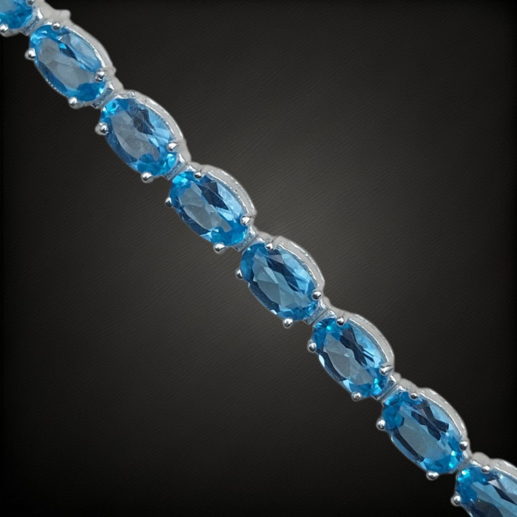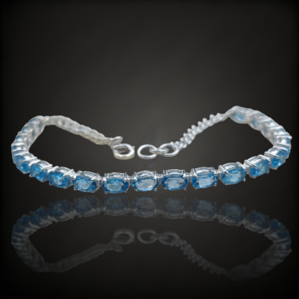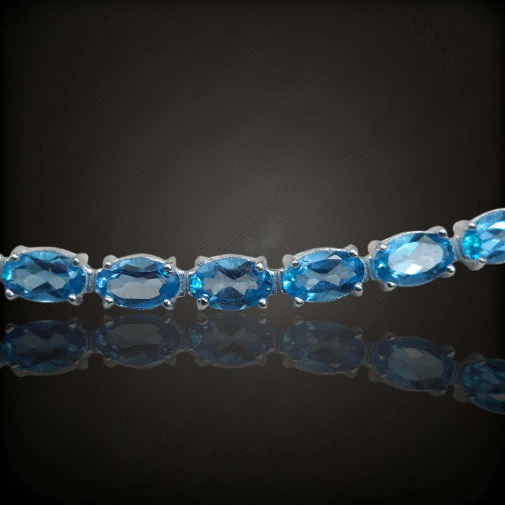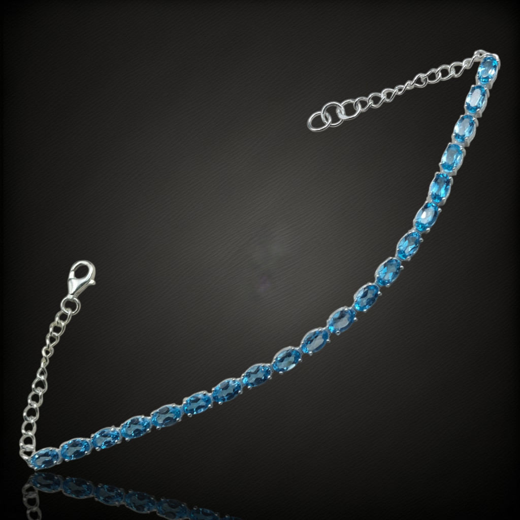 Prémium swissblue topáz köves állítható méretű ezüst karkötő.A karkötő 15.5-18cm között állítható.A kövek nagysága 5x3mm, származási helyük: BrazíliaAz ékszer anyaga 925-ös ezüst.A kövek színe élőben kis mértékben eltérhet a képen láthatótól!