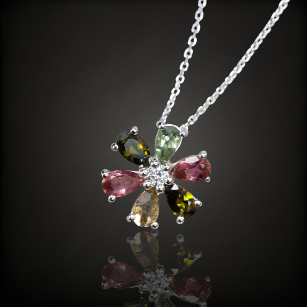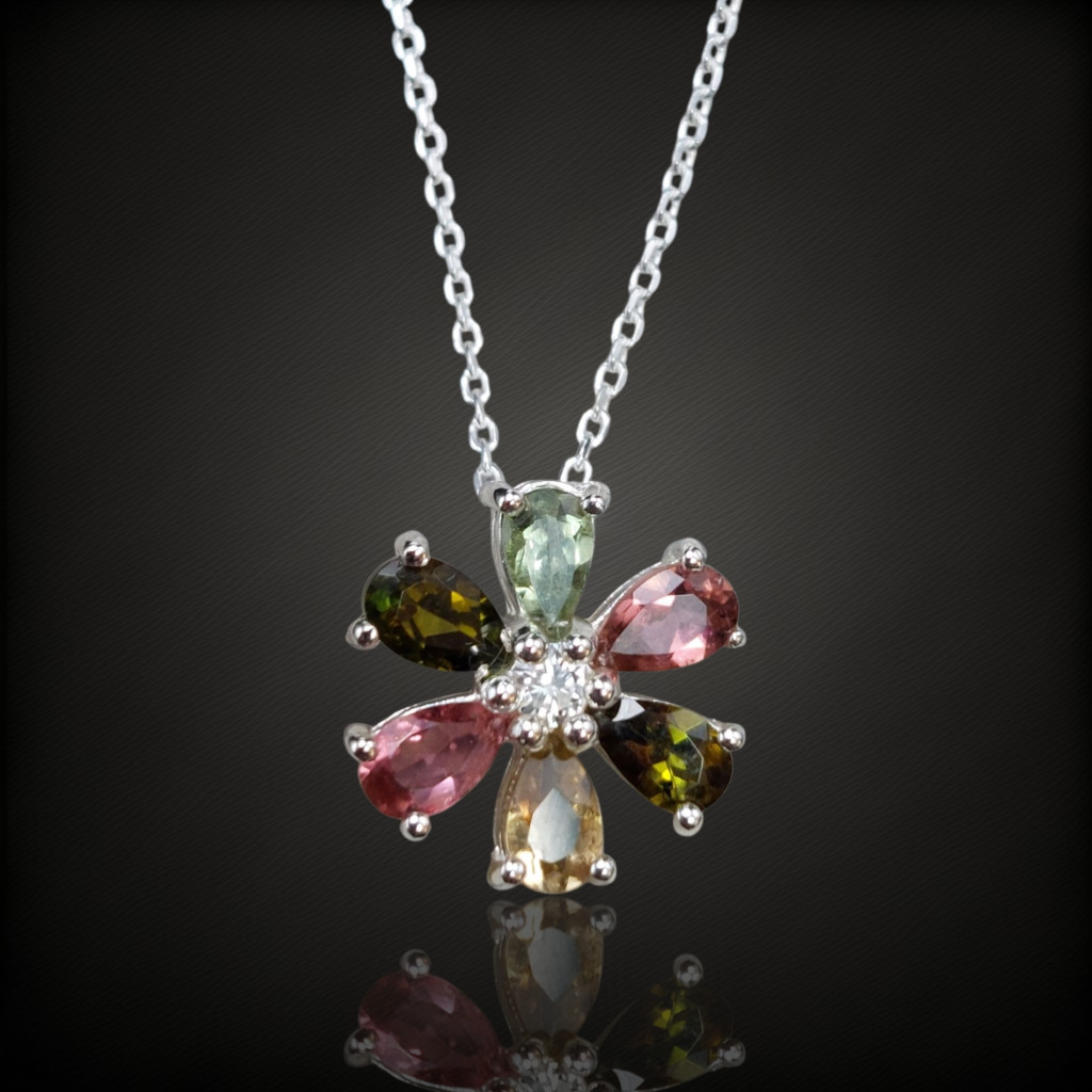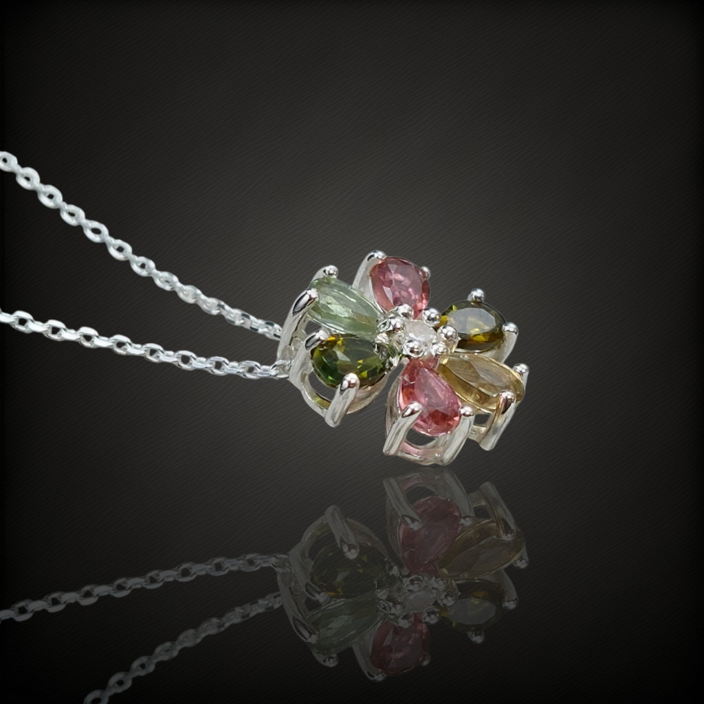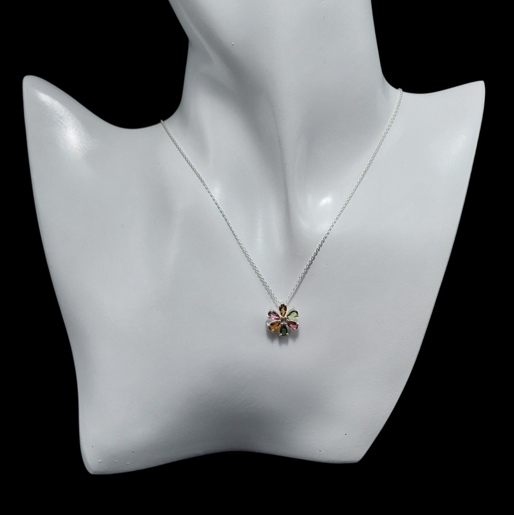 Virág formájú turmalin ezüstmedál.A medál nagysága 13x13mm.A kövek származási helye: NigériaAz ékszer anyaga 925-os finomságú ezüst.A kő színe élőben kis mértékben eltérhet a képen láthatótól.Az ezüstnyaklánc tartozék a medálhoz, mely 41-46cm között állítható.