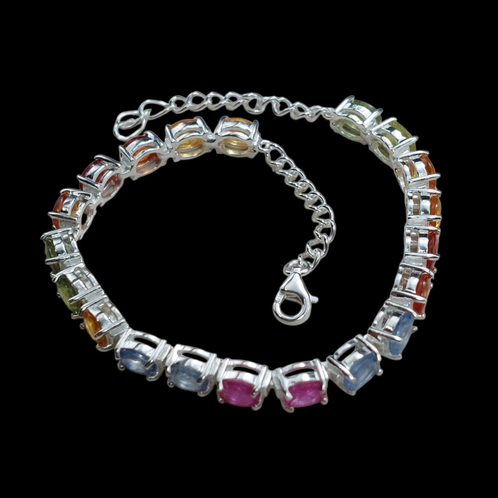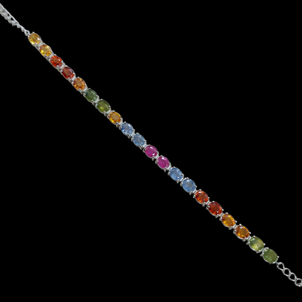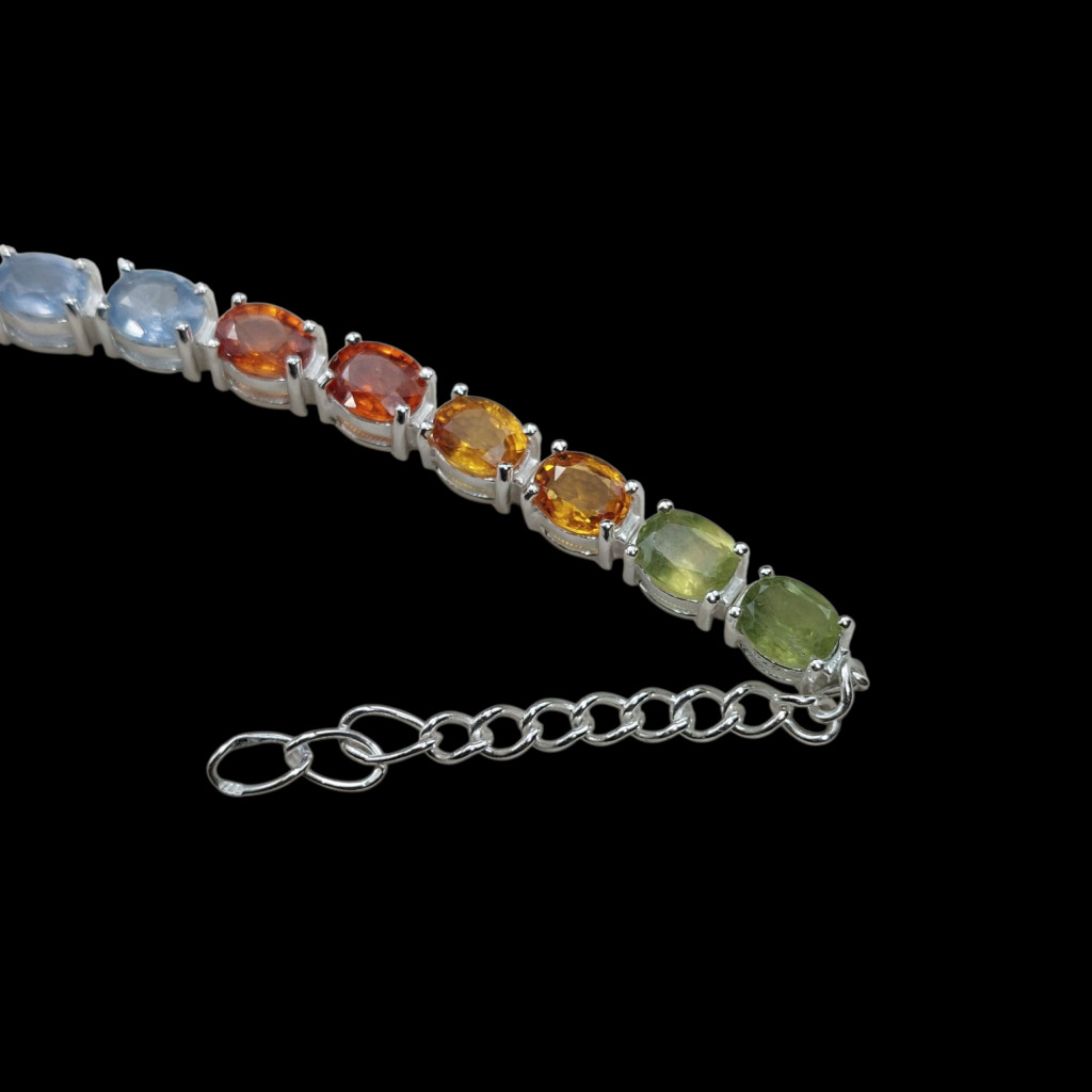 Prémium minőségű többszínű zafír köves ezüst karkötő A kövek nagysága: 5x3mm, származási helyük: MadagaszkárA lánc hosszúsága 16-19cm között állítható.Az ékszer anyaga 925-ös finomságú.A kövek színe élőben kis mértékben eltérhet a képen láthatótól.