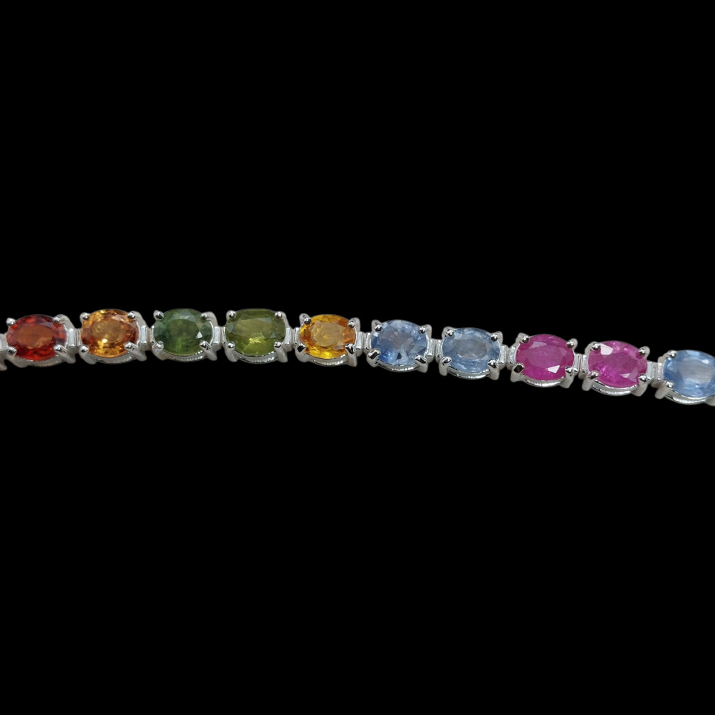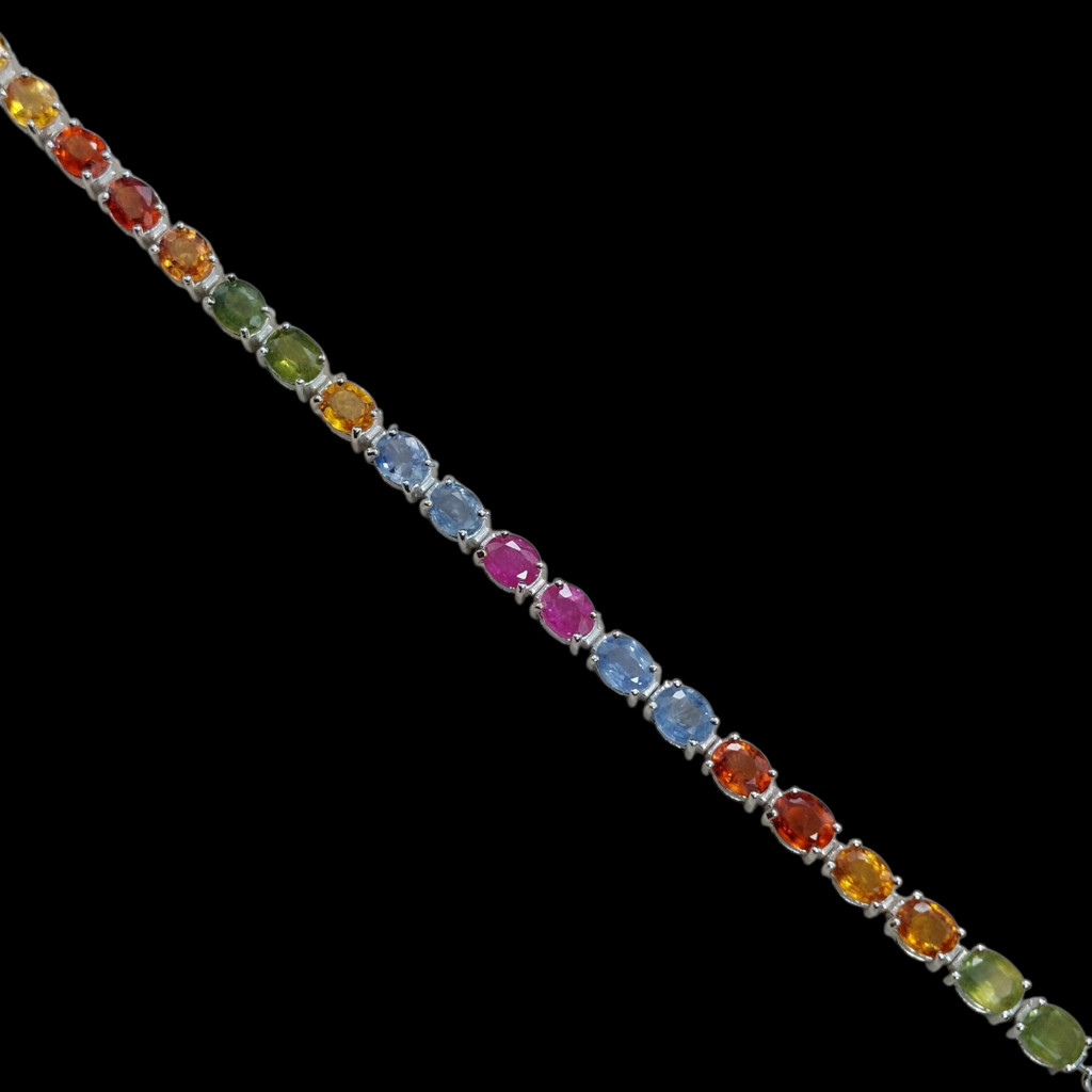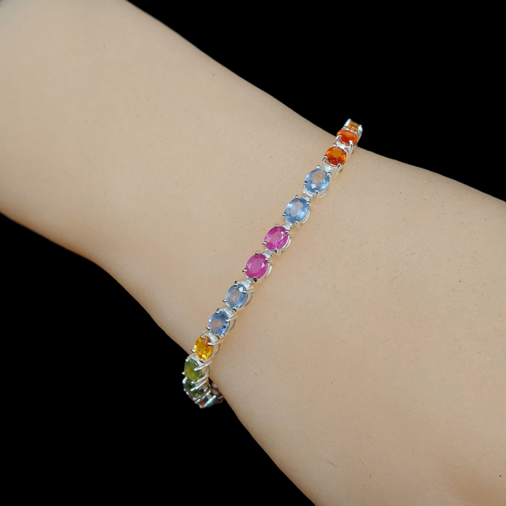 Prémium minőségű többszínű zafír köves ezüst karkötő A kövek nagysága: 5x3mm, származási helyük: MadagaszkárA lánc hosszúsága 16-19cm között állítható.Az ékszer anyaga 925-ös finomságú.A kövek színe élőben kis mértékben eltérhet a képen láthatótól.
