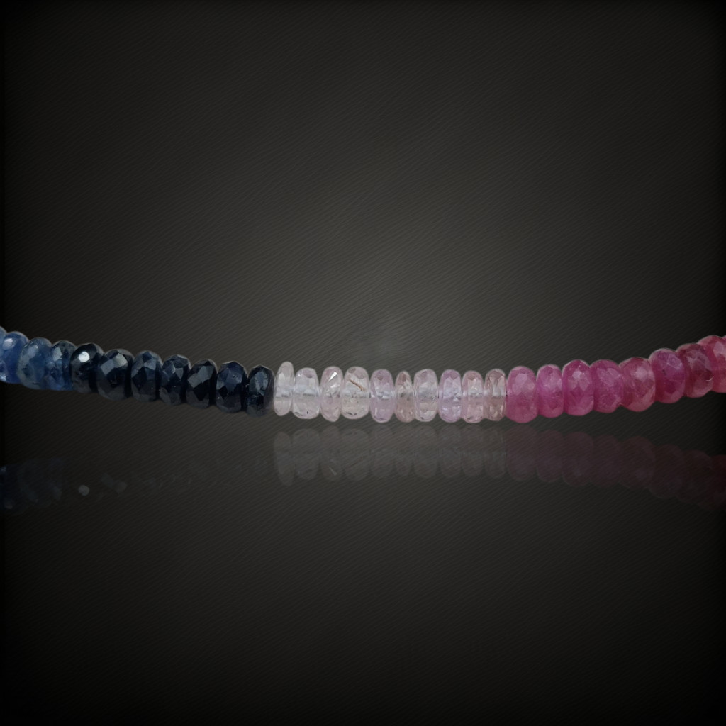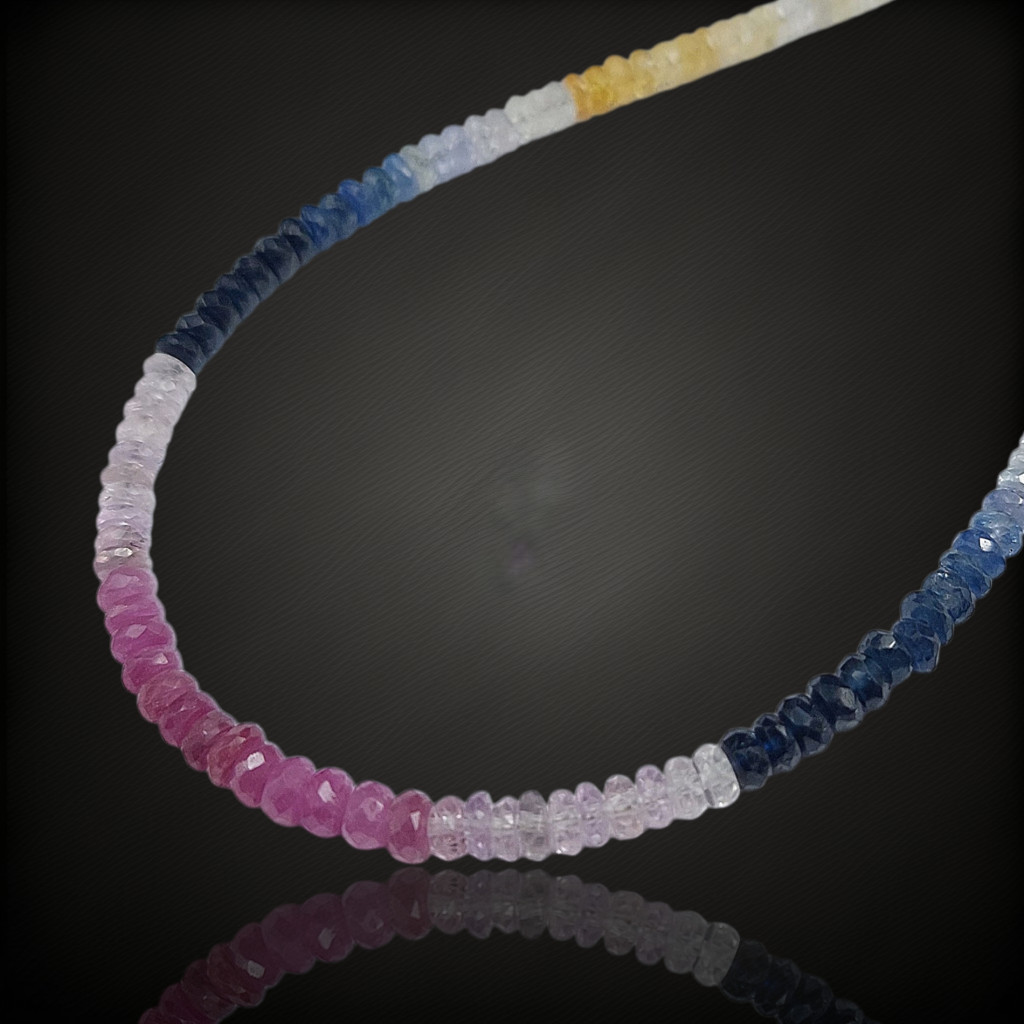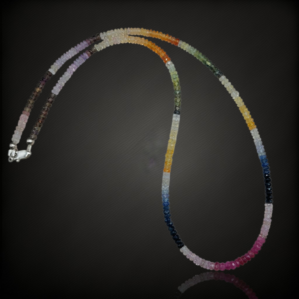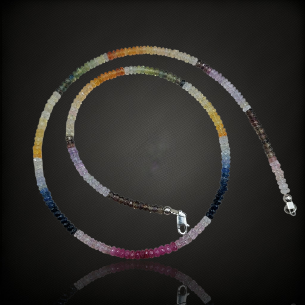 Többszínű zafír nyaklánc.A nyaklánc 45cm hosszú.A szemek fazettált csiszolásúak, nagyságuk: 4mm.Az ékszer szereléke 925-ös finomságú ezüst.A kövek színe élőben kis mértékben eltérhet a képen láthatótól!