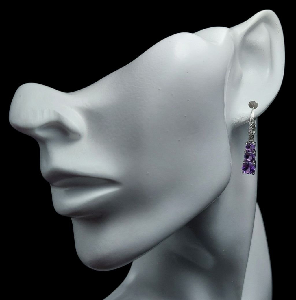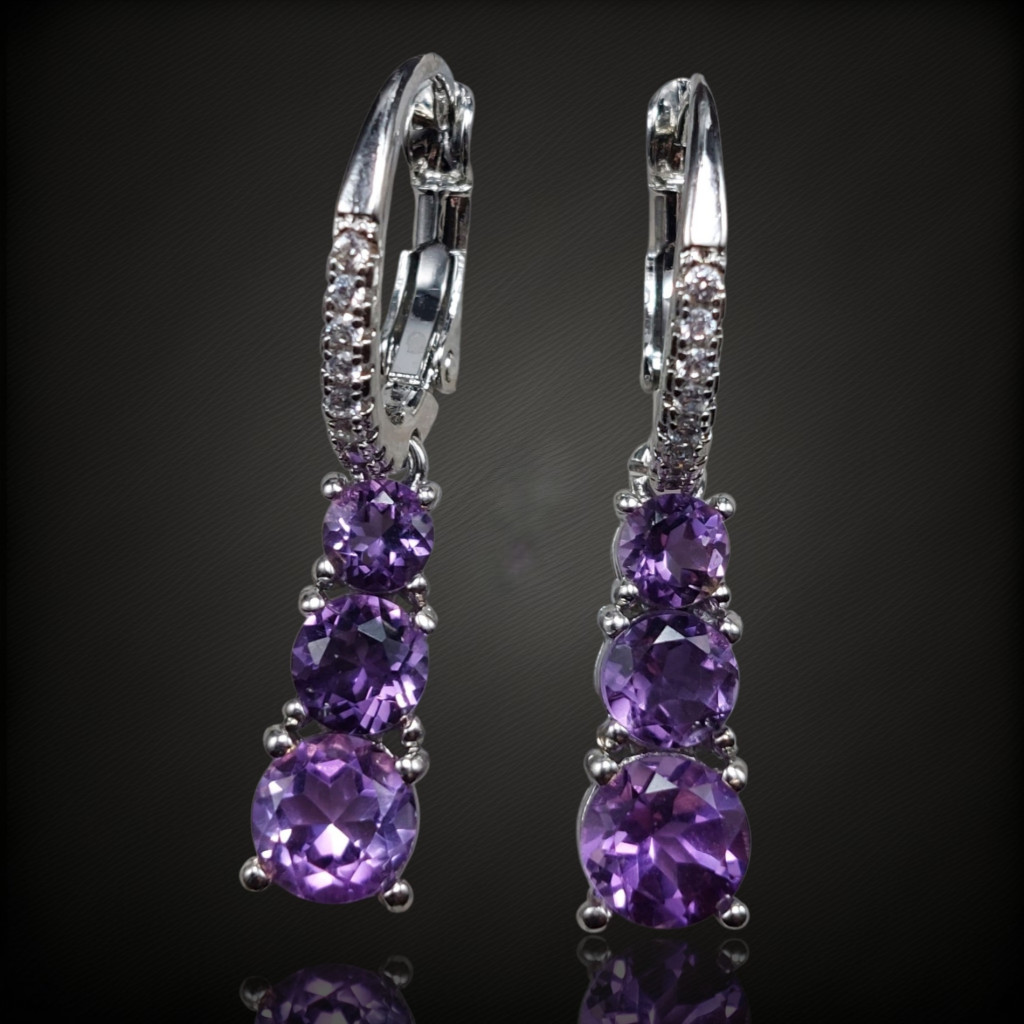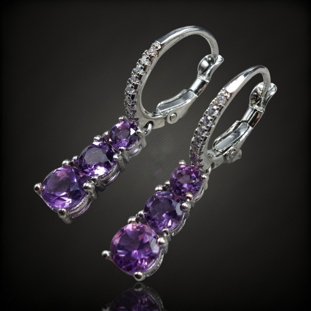 Ametiszt köves lógós fazonú ezüst fülbevaló cirkónia díszítéssel