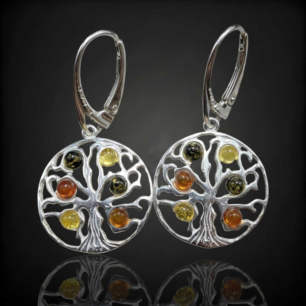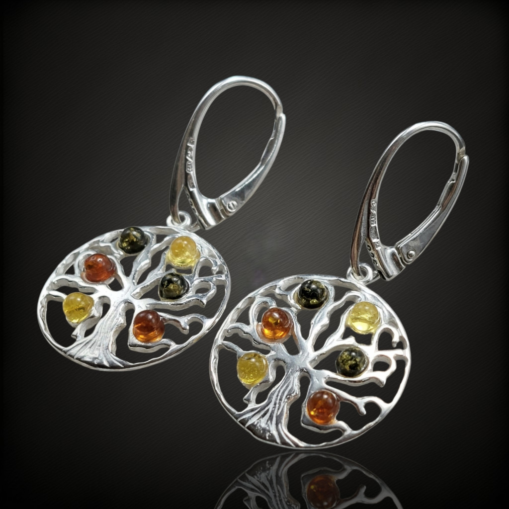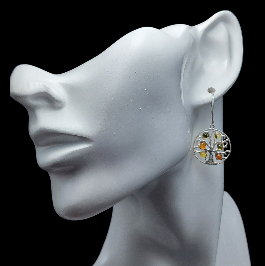 Borostyán köves lógós fazonú ezüst fülbevaló.A fülbevaló hossza akasztóval együtt 38mm.Az ékszer anyaga 925-ös finomságú ezüst.A kövek színe élőben kis mértékben eltérhet a képen láthatótól.
