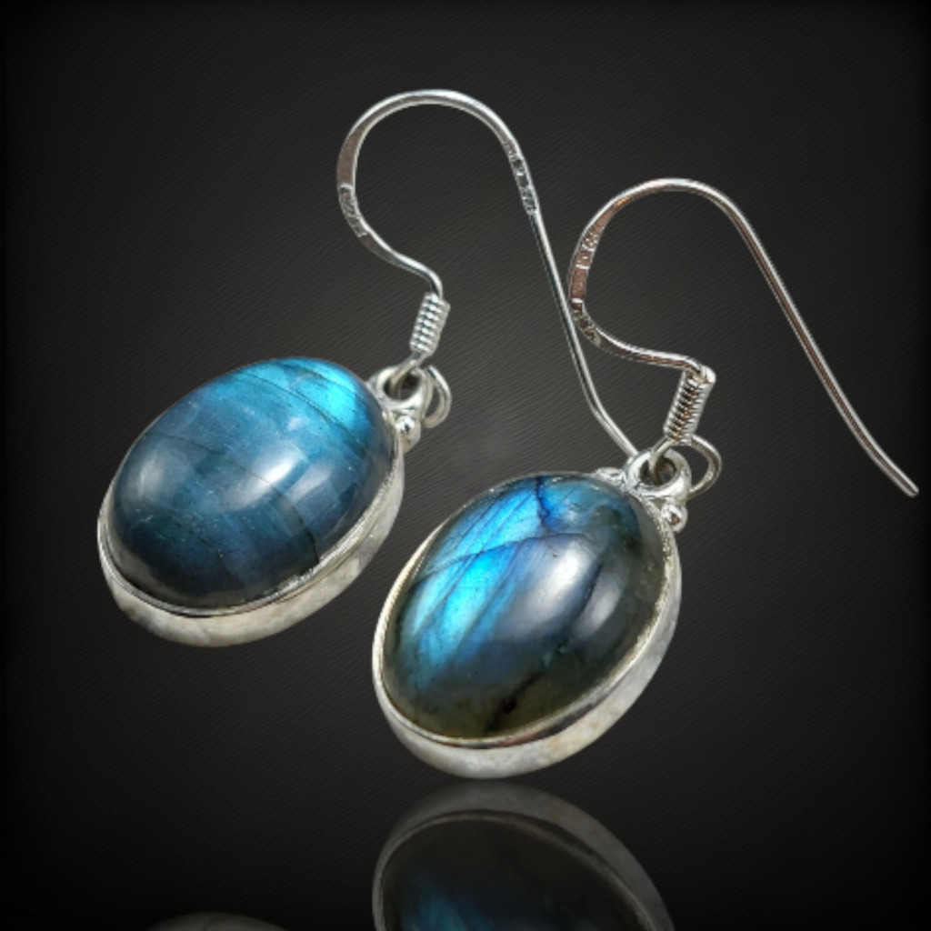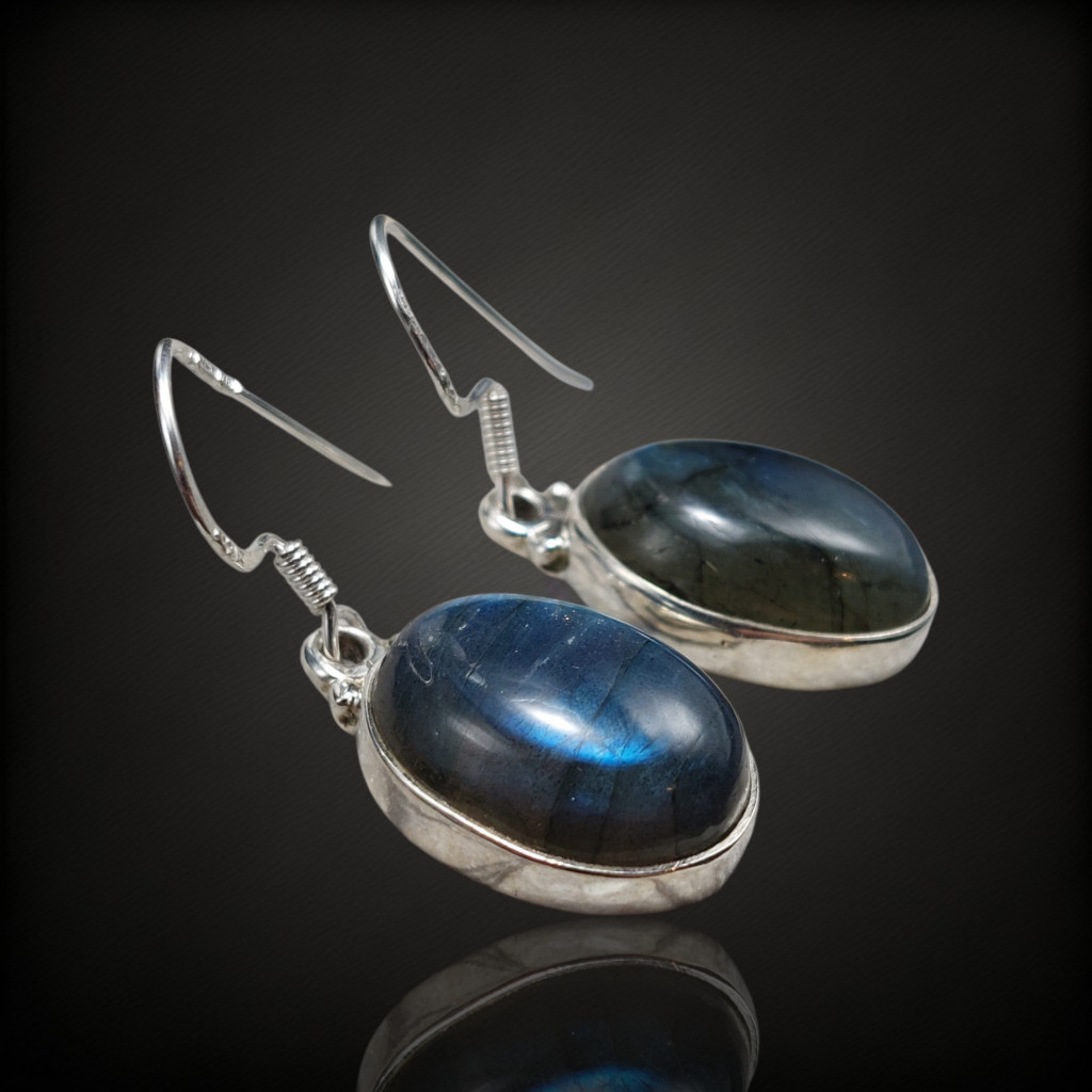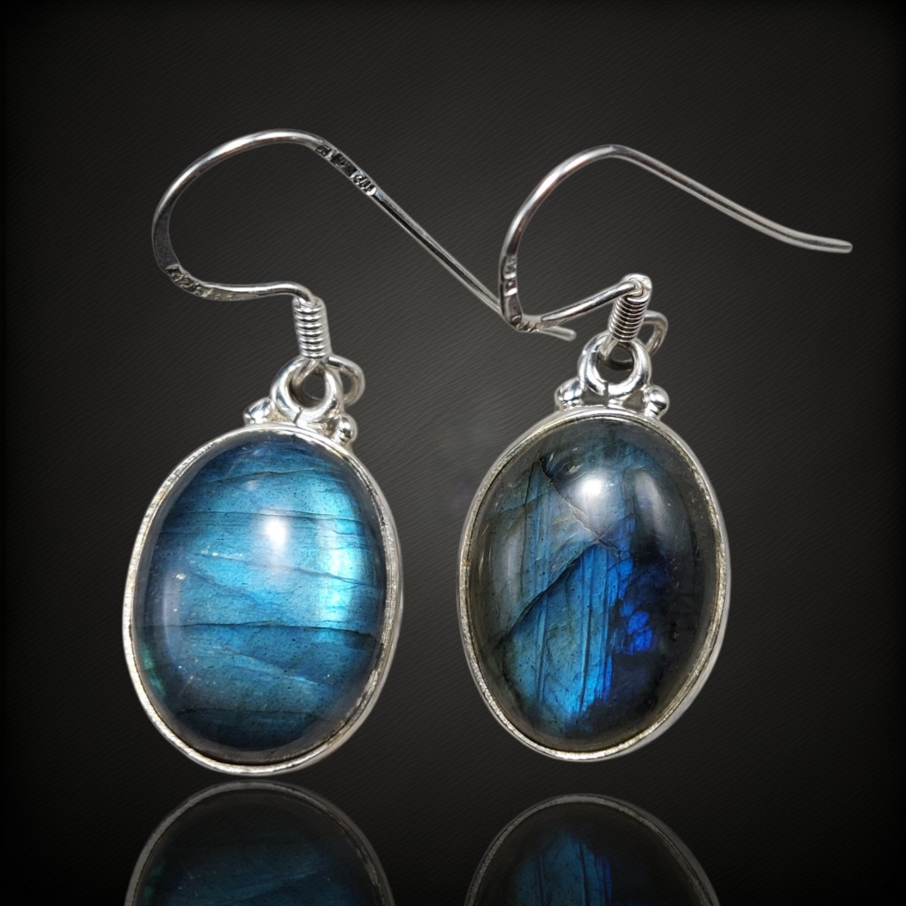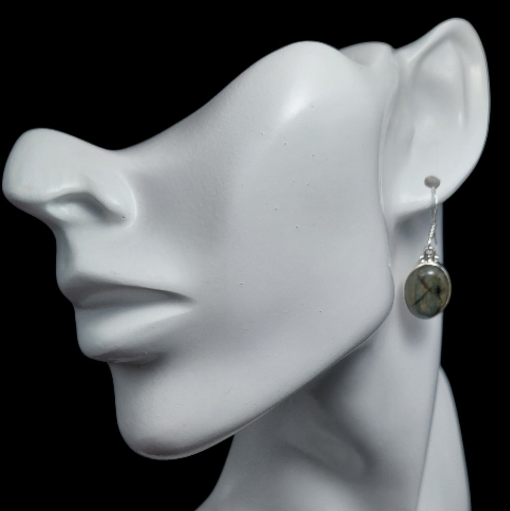 Labradorit köves lógós fazonú ezüst fülbevaló.